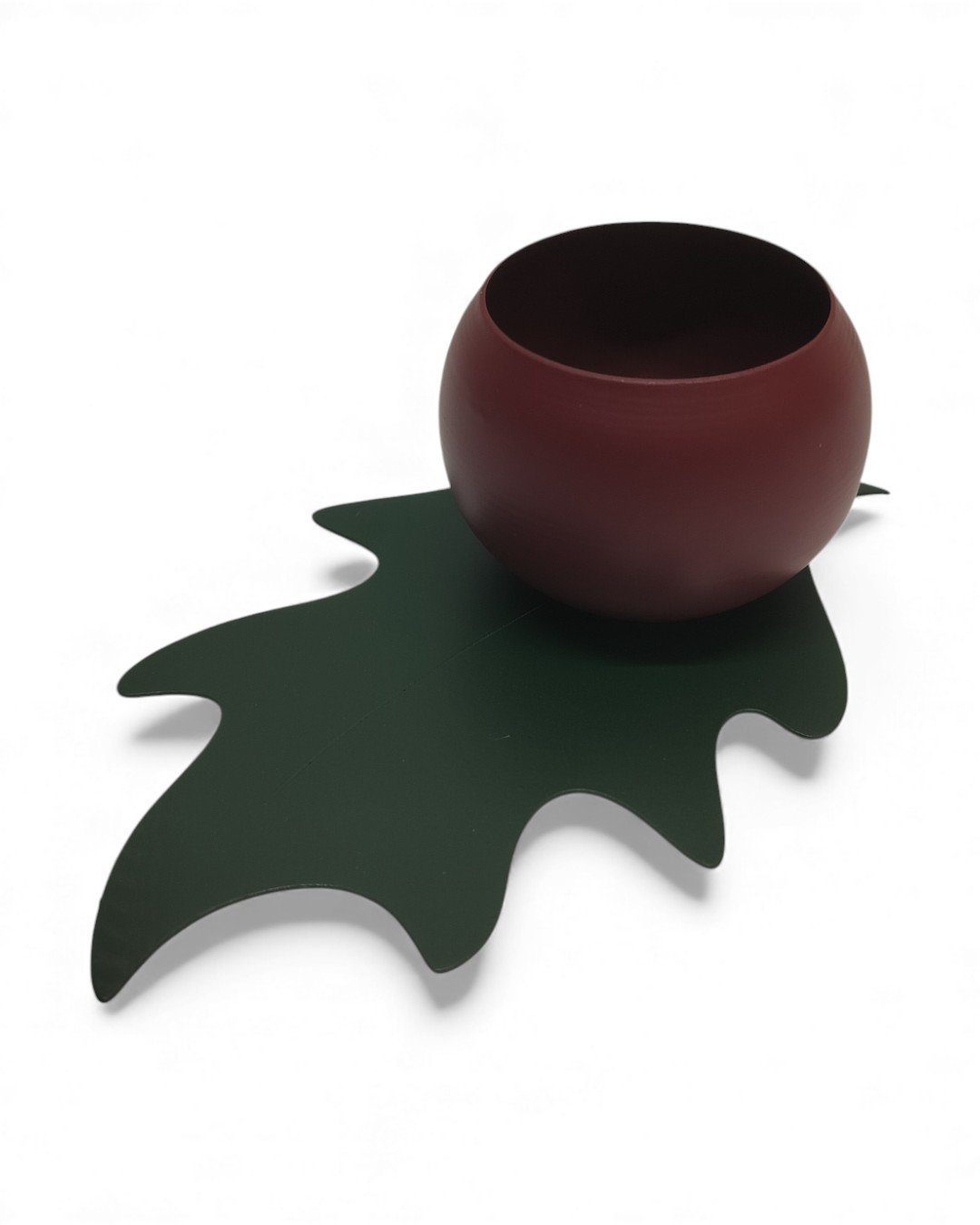 This striking decorative piece features a minimalist, stylized oak leaf silhouette that serves as a tray or platter base. The leaf is crafted from metal and finished in a deep, matte forest green. Resting on the leaf is a single, smooth, spherical bowl with a wide opening, intended to hold a small pillar candle, tealight, or votive. This candle holder component is finished in a rich, matte burgundy or deep maroon color. The composition highlights a sleek, modern aesthetic, pairing two classic autumnal and holiday colors in a clean design. It is perfect for use as a centerpiece or an accent piece on a side table during the fall and winter seasons.