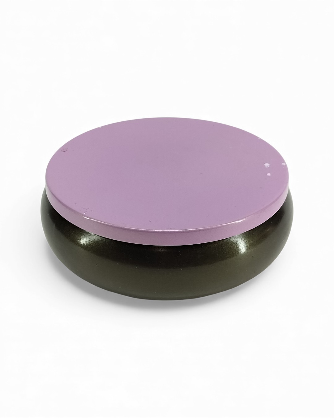 A low-profile, contemporary storage box featuring a wide, rounded base and a flat circular lid. The base is finished in a rich, metallic dark bronze/olive tone, providing a subtly reflective surface. This is beautifully contrasted by the dusty lilac/mauve lid, which has a matte or semi-gloss finish. Its squat, sleek design makes it perfect for a desk, bedside table, or coffee table to store small accessories, keys, or jewelry while adding a modern color pairing.