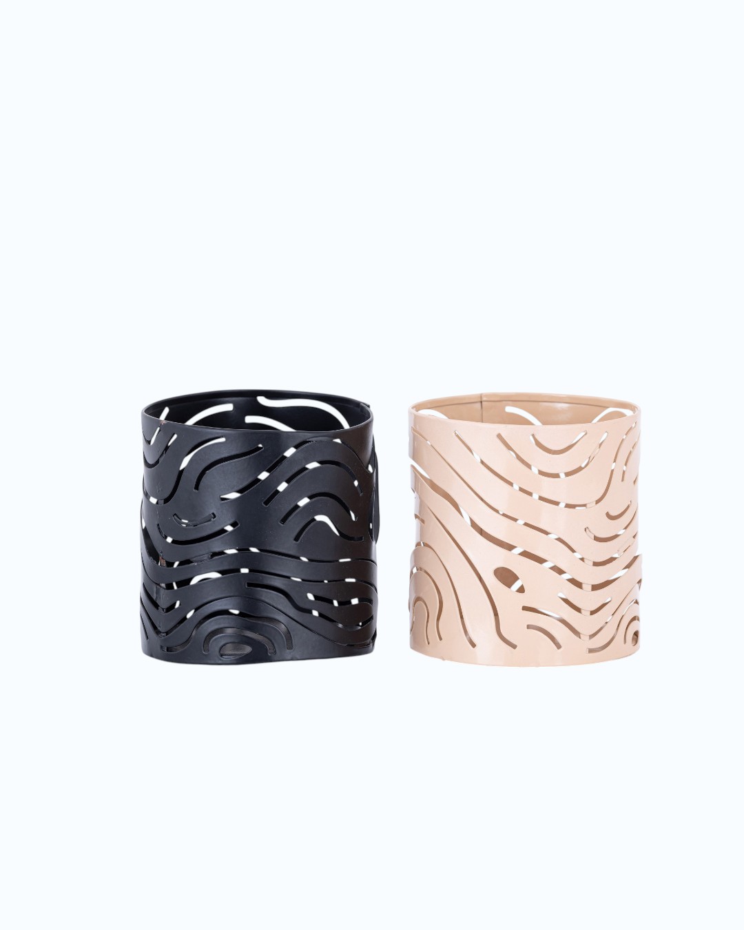 A set of two cylindrical holders showcasing organic, flowing line cut-outs for a soft light dispersal. These versatile pieces blend minimalist design with earthy tones to complement any tabletop decor.