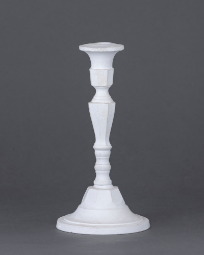 This candlestick holder combines a traditional, turned design with a modern, angular twist. The stem and base feature a series of subtle facets that catch the light, creating a dynamic surface. Finished in a soft, matte cream color, the piece has a clean and refined look that will complement a wide range of decor styles. It is a simple yet elegant item that adds texture and height to a space without overwhelming it.