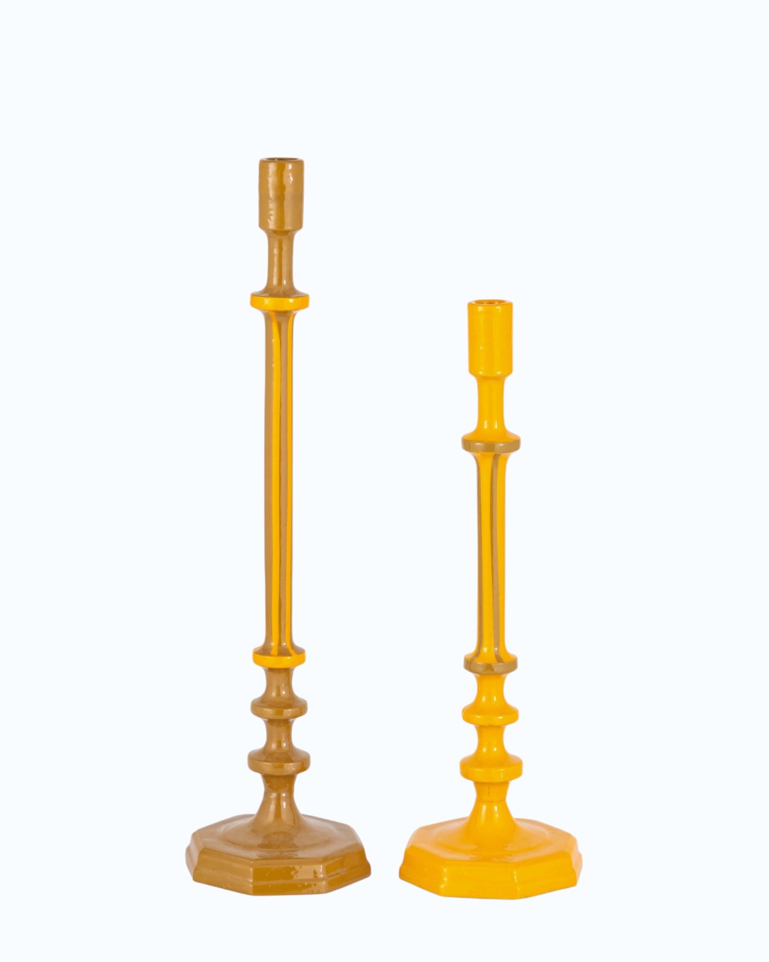 These elegant, hand-painted taper sticks feature a classic turned-wood silhouette with a modern color twist. The vertical stripe detailing and tiered bases provide a sophisticated, elongated profile for a dining centerpiece.