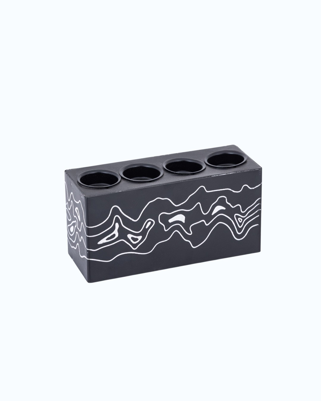 Rectangular block holders featuring four recessed tea light slots and an organic, wavy line pattern on the sides. They come in a variety of matte tones including dusty rose, lilac, and classic black.
